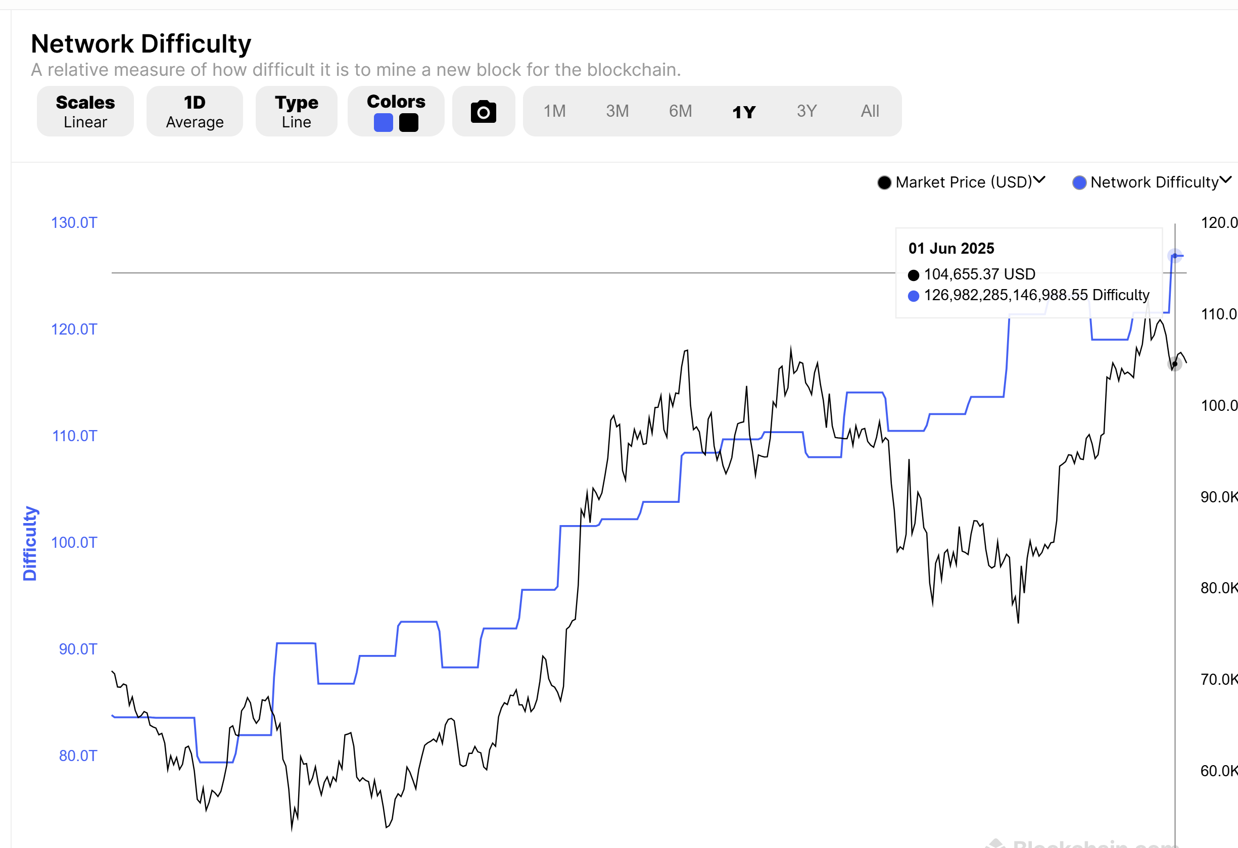 Vào ngày 1 tháng 6, độ khó khai thác Bitcoin đã đạt mức cao kỷ lục mới là 126,98 nghìn tỷ, theo dữ liệu từ Blockchain.com. Sự gia tăng về độ khó phản ánh sự cạnh tranh ngày càng tăng giữa các thợ đào và sự gia tăng về bảo mật mạng.
