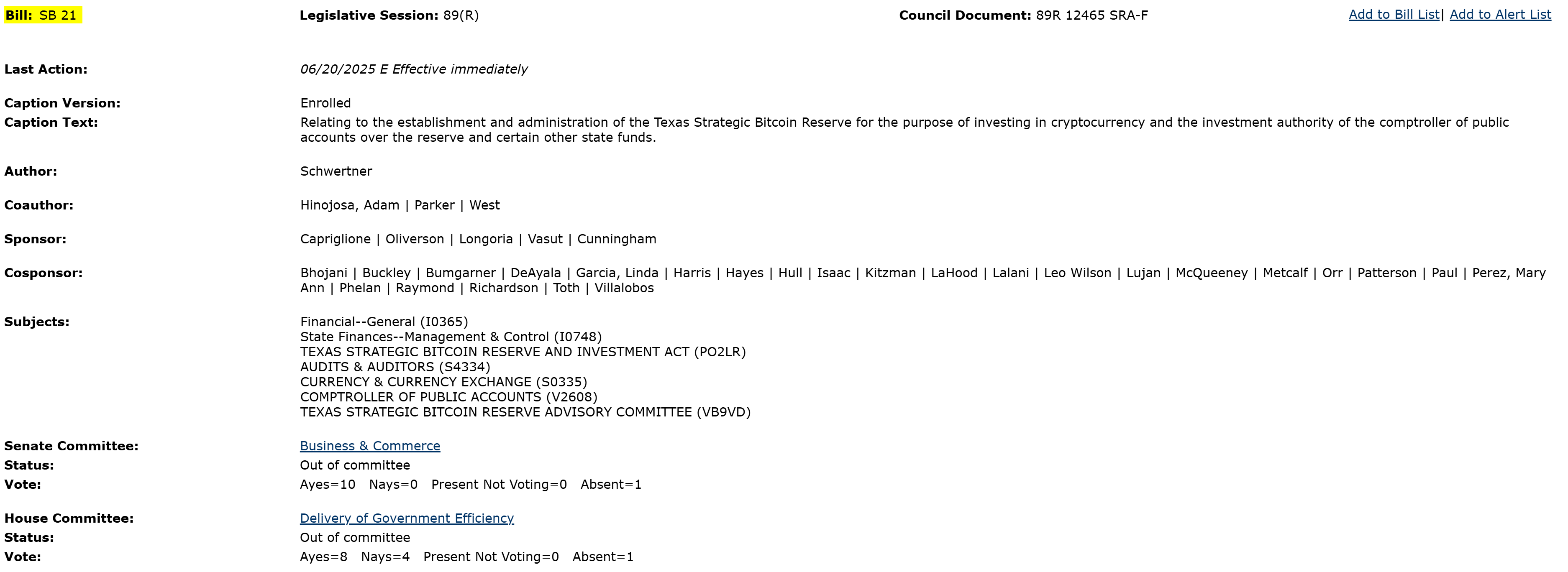 Texas trở thành tiểu bang thứ ba tại Hoa Kỳ thông qua luật về quỹ dự trữ Bitcoin, sau Arizona và New Hampshire. Tuy nhiên, khác với hai tiểu bang kia, Texas là tiểu bang đầu tiên cam kết sử dụng nguồn vốn công và thiết lập một cơ cấu riêng biệt để nắm giữ Bitcoin.
