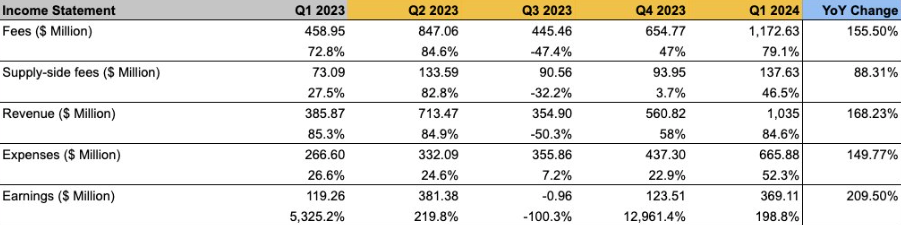 Phí và doanh thu Ethereum quý 1 năm 2024 tăng lần lượt 79% và 85% so với quý trước. Theo dữ liệu, Ethereum đã đạt được 1,2 tỷ USD doanh thu từ phí giao dịch trong quý 1 năm 2024, cao hơn 155% so với quý đầu tiên năm ngoái.