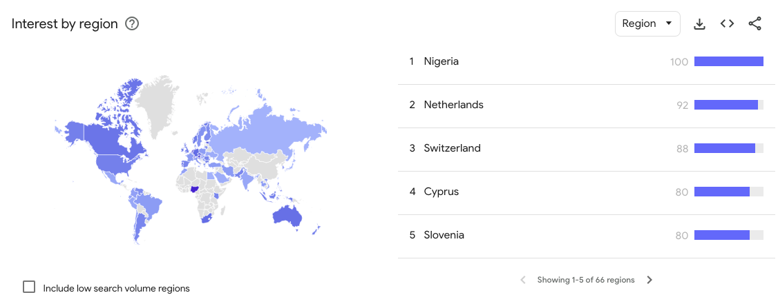 Google Trends cho thấy việc halving Bitcoin nhận được sự quan tâm nhiều nhất từ ​​Nigeria, Hà Lan, Thụy Sĩ và Síp.
