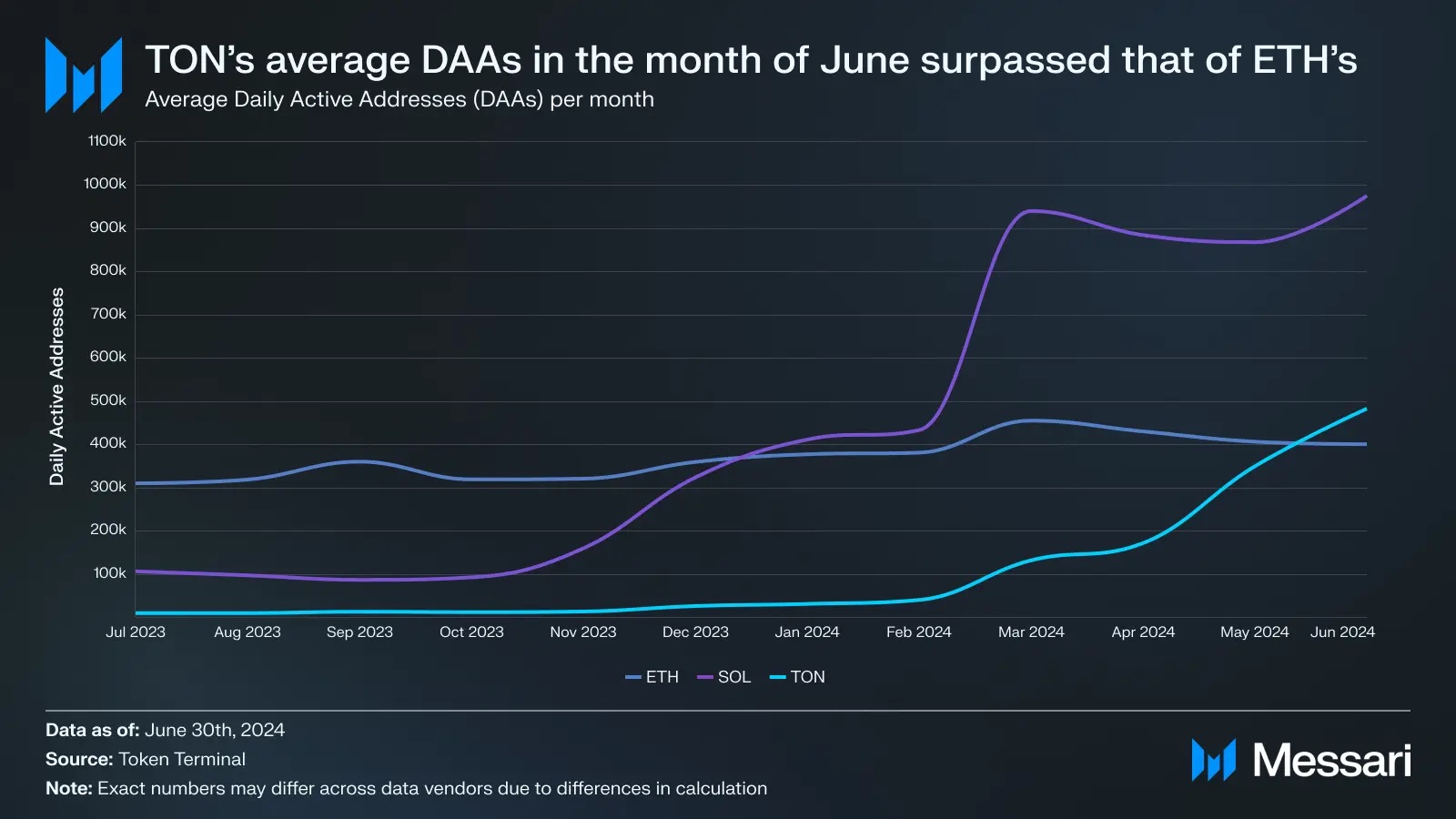 Trong bài đăng ngày 6 tháng 7 trên X, Messari lưu ý rằng số lượng địa chỉ hoạt động hàng ngày trên mạng TON đã vượt qua Ethereum trong tháng 6.