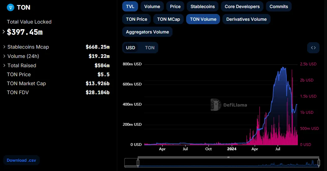 Dữ liệu gần đây cho thấy sự tăng trưởng đáng kể trong hệ sinh thái TON. Tổng giá trị bị khóa (TVL) trên mạng lưới đang tiến gần đến 400 triệu USD, tăng vọt từ mức thấp 21 triệu USD vào đầu tháng 3. Việc tích hợp USDT của Tether đã đóng vai trò quan trọng trong việc thúc đẩy khối lượng giao dịch và hoạt động của người dùng,
