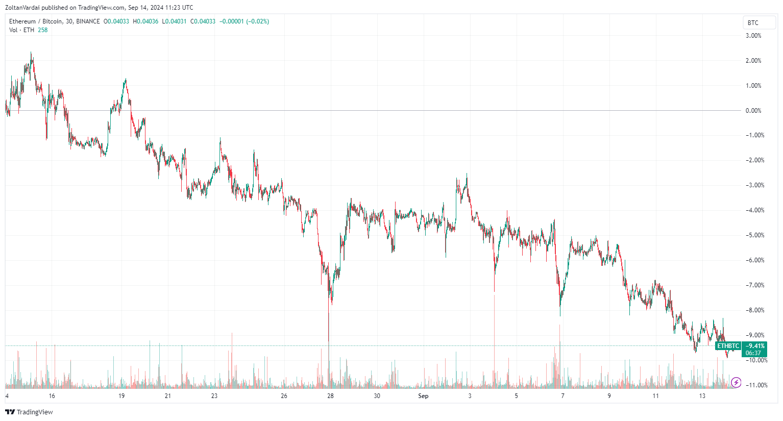 Kể từ đầu năm 2024, Ether đã hoạt động kém hơn so với Bitcoin. Theo dữ liệu của Binance, giá của Ether so với Bitcoin đã giảm hơn 24% kể từ đầu năm (YTD) và hơn 9% trong tháng qua.