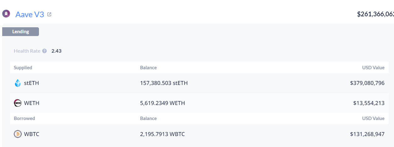 Từ ngày 10 tháng 1 đến ngày 1 tháng 7, anh ấy đã vay 3.061 WBTC(172M) từ Aave và đổi lấy 56.445 ETH với tỷ giá 0,05424. Từ ngày 7 tháng 8, anh ấy đã chi 12M USDC để mua 211 WBTC và đổi 16.000 ETH lấy 671 WBTC(39,9M) với tỷ giá 0,042 USD để trả nợ trên Aave.