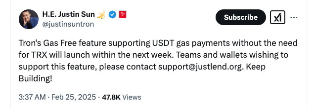 “Tính năng Gas Free của Tron hỗ trợ thanh toán gas USDT mà không cần TRX sẽ được ra mắt trong tuần tới,” Sun đã thông báo trong một bài đăng trên X vào ngày 25 tháng 2.