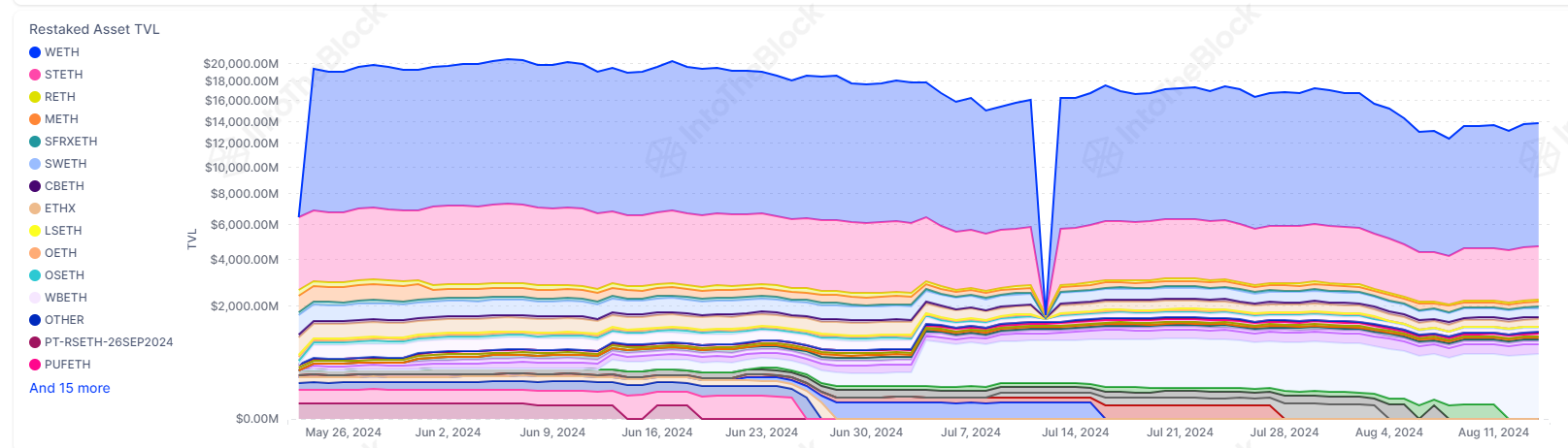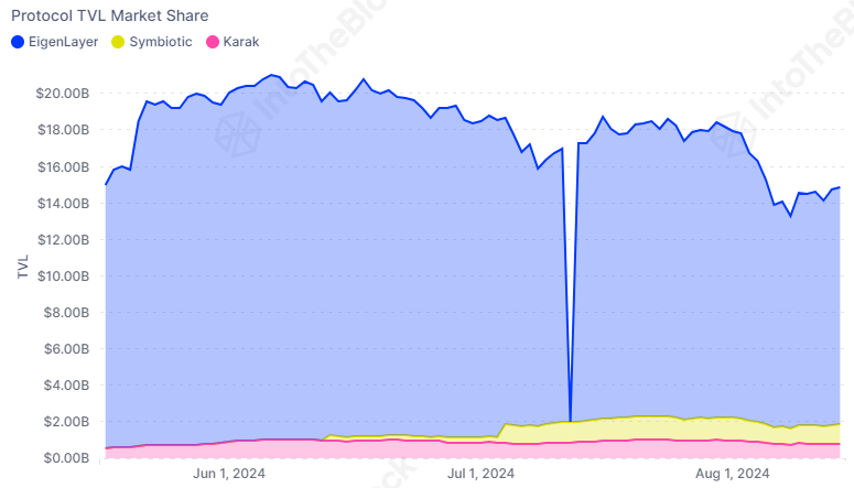 Nhìn chung, tổng giá trị TVL của thị trường restaking của các giao thức lớn nhất đã tăng từ 13,3 tỷ USD lên 14,5 tỷ USD vào ngày 8 tháng 8.