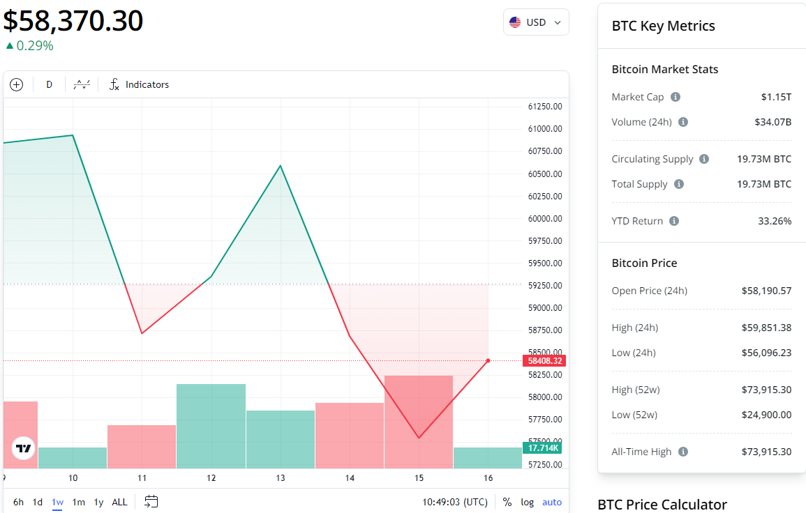 Bitcoin đã giảm xuống dưới 60.000 USD vào ngày 14 tháng 8. Đồng tiền điện tử đầu tiên trên thế giới đã giảm 3,3% trên biểu đồ hàng tuần, giao dịch ở mức 58.370 USD tính đến thời