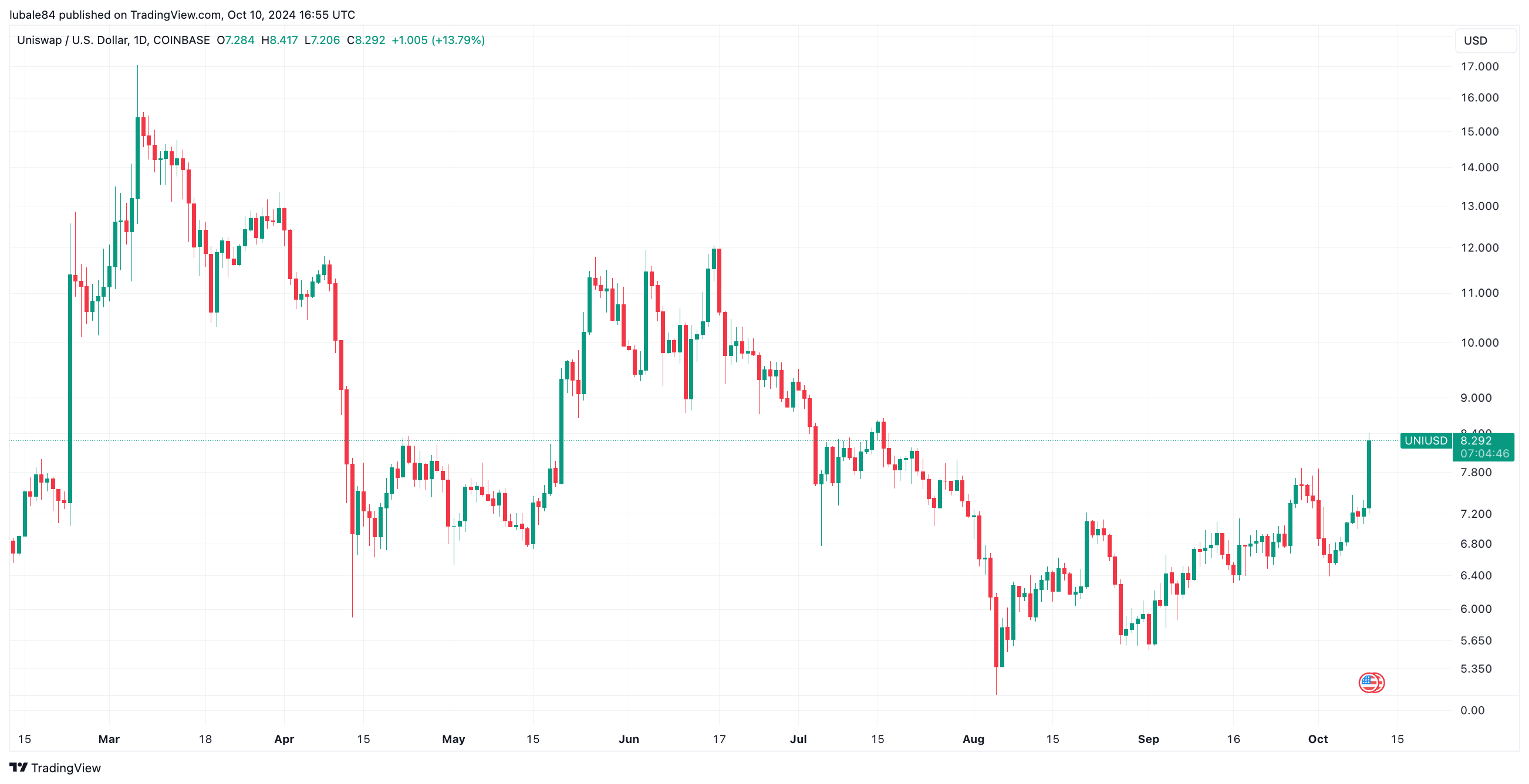 Sau thông báo này, giá UNI đã tăng hơn 17% từ mức mở cửa là 7,20 USD lên mức cao nhất trong ngày là 8,46 USD vào ngày 10 tháng 10.