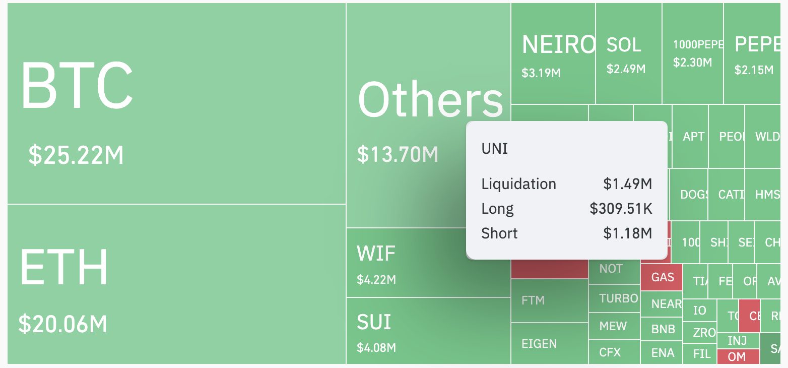 Theo dữ liệu của CoinGlass, đợt tăng giá cũng chứng kiến Uniswap trở thành một trong những token bị thanh lý nhiều nhất trong 12 giờ qua. Hình bên dưới cho thấy hơn 1,5 triệu USD vị thế UNI có đòn bẩy đã bị thanh lý trong 12 giờ qua, với 1,2 triệu USD đến từ các vị thế short.