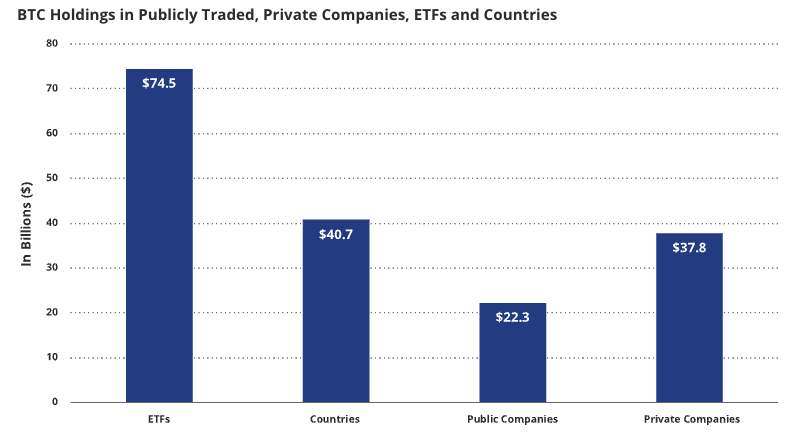 VanEck cho biết trong một báo cáo mới rằng tổng cộng khoảng 175 tỷ USD Bitcoin hiện đang được nắm giữ bởi nhiều quỹ ETF, các quốc gia và các công ty đại chúng và tư nhân.