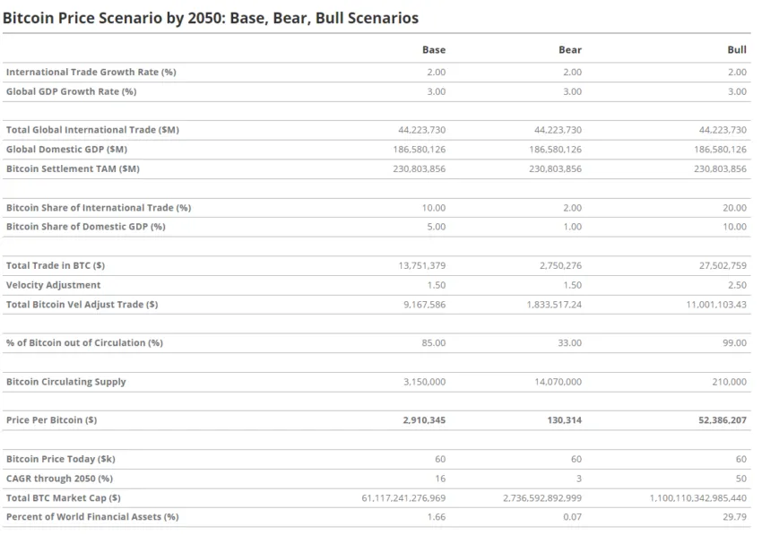 Có thể tưởng tượng rằng vào năm 2050 Bitcoin có thể được sử dụng để thanh toán 10% thương mại quốc tế toàn cầu và 5% thương mại nội địa của thế giới. Kịch bản này sẽ dẫn đến việc các ngân hàng trung ương nắm giữ 2.5% tài sản của họ bằng BTC.