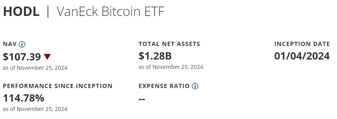 Theo trang web của ETF, VanEck Bitcoin ETF có tài sản ròng khoảng 1,28 tỷ USD