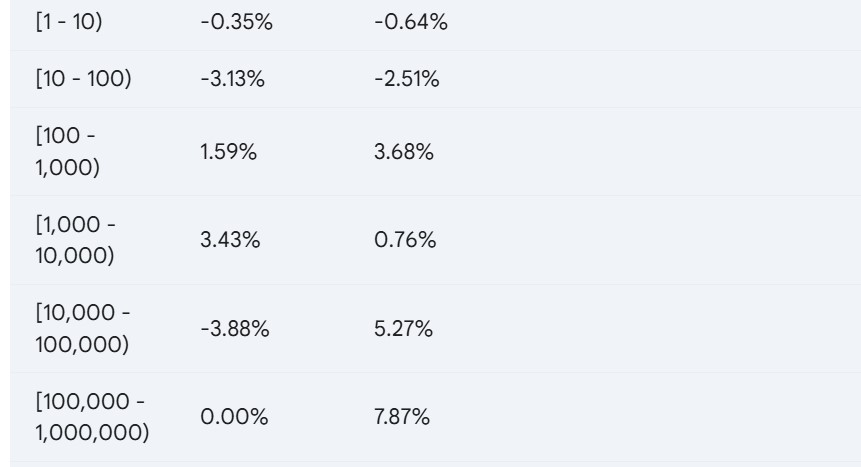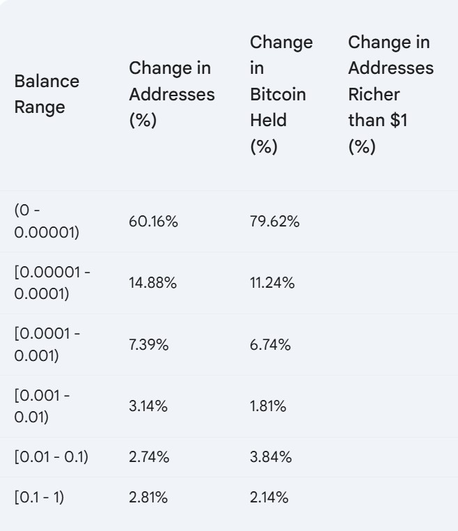Trong khi mức tăng khoảng 76% về số lượng ví chứa ít hơn 0,0001 BTC (trị giá 6,32 USD tại thời điểm viết bài viết này) có thể cho thấy sự gia tăng của người dùng mới, thì nó cũng có thể giải thích cho một số sự suy giảm xảy ra ở nhóm trung lưu.