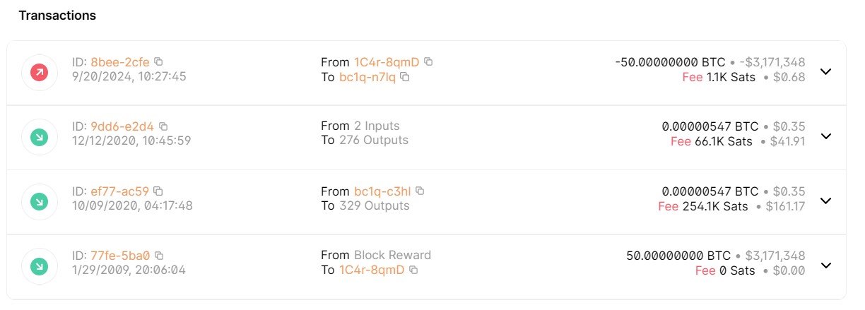 Vào ngày 20 tháng 9, năm ví khai thác nhận được 50 Bitcoin (BTC) mỗi ví dưới dạng phần thưởng khối vào năm 2009 đã bắt đầu chuyển tiền của họ. Dữ liệu blockchain cho thấy một ví đã nhận được phần thưởng khai thác vào ngày 29 tháng 1 năm 2009, trong khi ba ví đã nhận được phần thưởng khối vào ngày 31 tháng 1 năm 2009. Ví còn lại đã nhận được phần thưởng khối vào ngày 2 tháng 2 năm 2009.