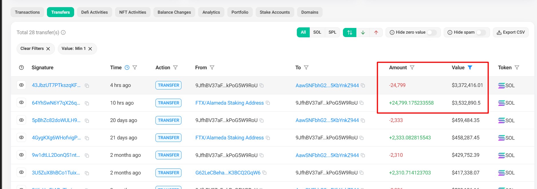 Ví FTX và Alameda gửi 3,3 triệu USD SOL cho Binance. Nguồn: Solscan.