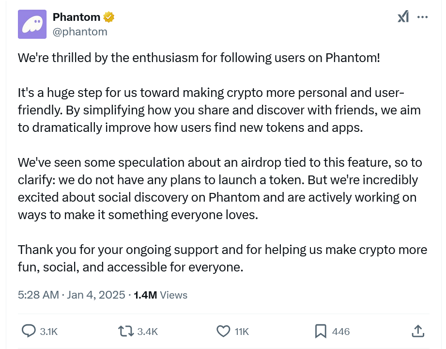 “Chúng tôi đã thấy một số suy đoán về một đợt airdrop gắn liền với tính năng này, vì vậy để làm rõ: chúng tôi không có bất kỳ kế hoạch nào để ra mắt token”, nhà cung cấp ví tiền điện tử phi lưu ký nhấn mạnh trong bài đăng ngày 3 tháng 1 trên X.