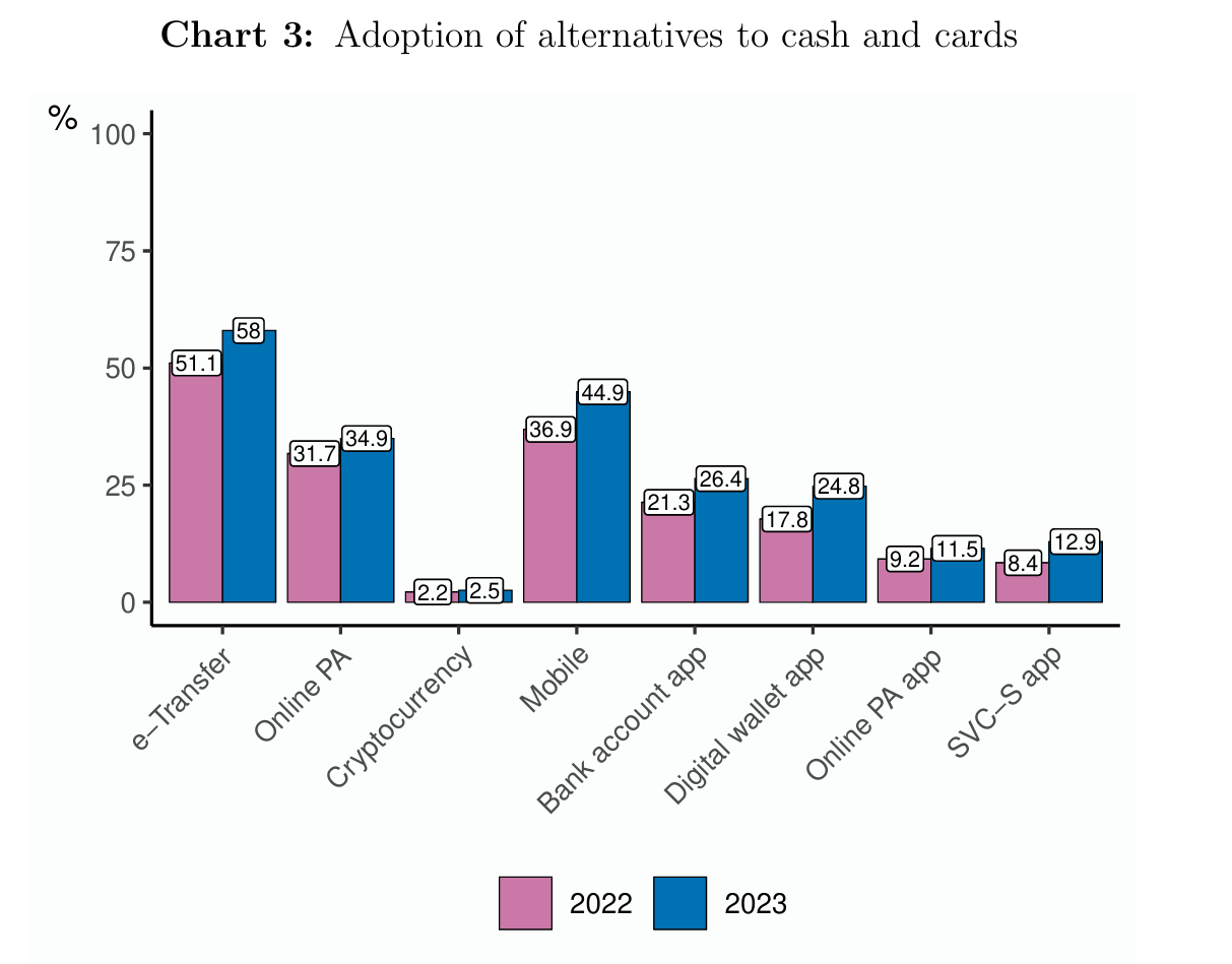 Một cuộc khảo sát thường niên của Bank of Canada cho thấy xu hướng của quốc gia này là sử dụng tiền mặt và thẻ ngân hàng để thanh toán vào năm 2022 và 2023. Việc sử dụng các phương thức thanh toán này nhìn chung đã tăng lên trong thập kỷ qua.
