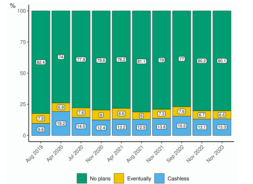 Lý do chính khiến tiền điện tử chậm được áp dụng ở Canada là sự miễn cưỡng rộng rãi trong việc không dùng tiền mặt. Hơn 80% số người được hỏi cho biết họ không có “kế hoạch ngừng sử dụng tiền mặt trong tương lai”, một xu hướng nhất quán kể từ năm 2019.