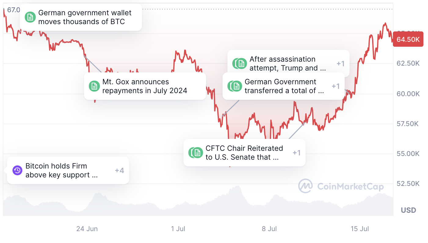 Việc bán tài sản đã đẩy giá Bitcoin xuống trong tháng 6. Đồng tiền điện tử này đã giảm 9,8% trong tháng, giảm từ khoảng 67.000 USD vào ngày 1 tháng 6 xuống còn khoảng 60.000 USD vào ngày 30 tháng 6. Đồng tiền điện tử hàng đầu này tiếp tục lao dốc vào tháng 7, giảm xuống dưới 55.000 USD trong thời gian ngắn trước khi phục hồi.