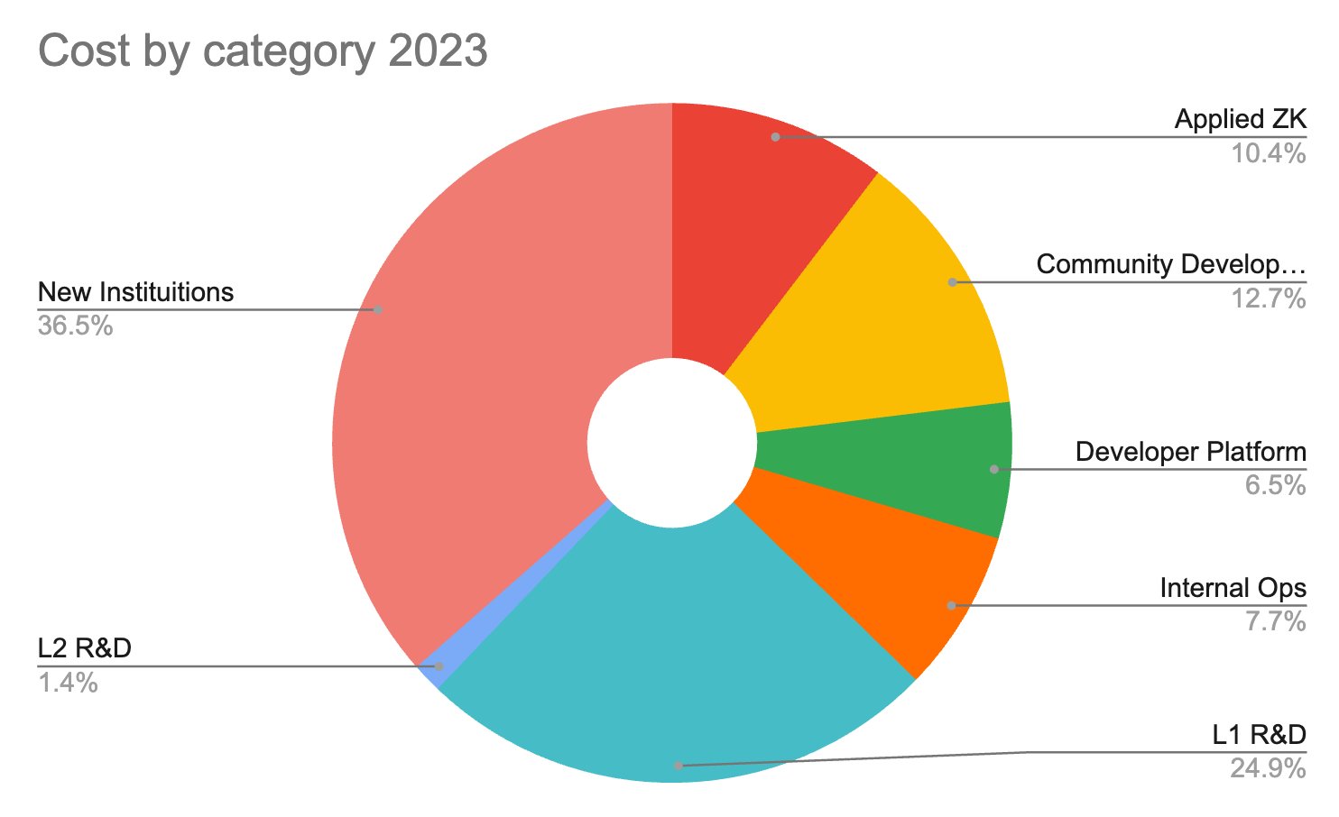 Phát triển cộng đồng là hạng mục chi tiêu lớn thứ ba của quỹ vào năm 2023, ở mức 12,7%. 25,9% chi tiêu vốn còn lại của quỹ được chia cho công việc ứng dụng zero-knowledge, hoạt động nội bộ, nghiên cứu layer-2 và nền tảng dành cho nhà phát triển.
