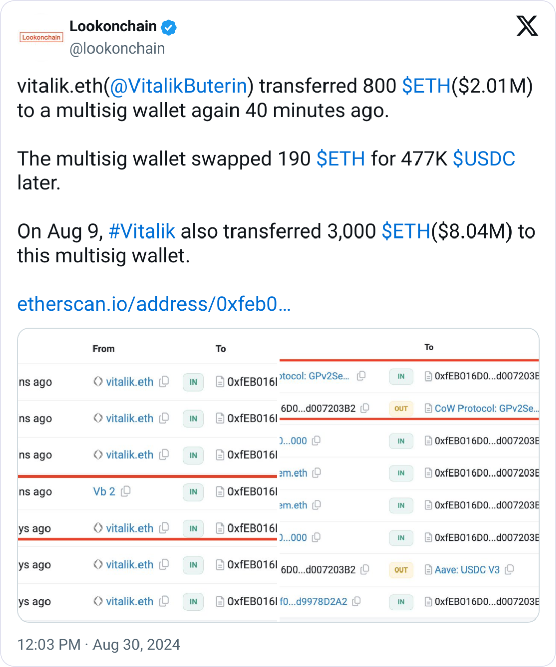 Vào ngày 30 tháng 8, một thành viên cộng đồng tiền điện tử trên X đã cáo buộc Buterin bán tháo hơn 2 triệu USD Ether (ETH). Công ty phân tích Onchain Lookonchain còn cho rằng cùng một địa chỉ ví đã nhận được 3.000 ETH từ Buterin này vào ngày 9 tháng 8.