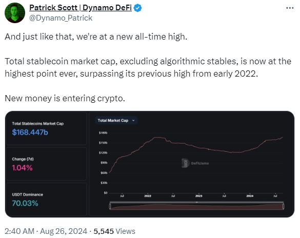 Nhà phân tích tiền điện tử Patrick Scott, còn được gọi là “Dynamo DeFi”, cho biết trong bài đăng ngày 26 tháng 8 trên X rằng ông nghĩ đây là dấu hiệu cho thấy “Dòng tiền mới đang đổ vào tiền điện tử”.