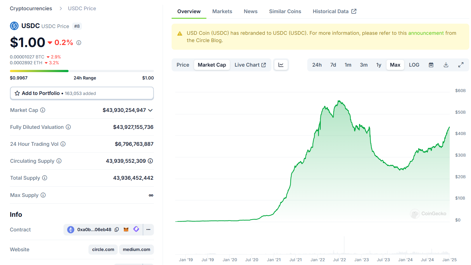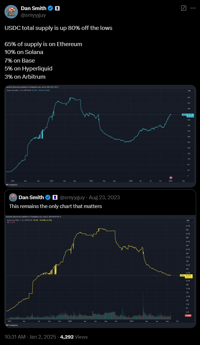 Tính đến ngày 2 tháng 1, nguồn cung lưu hành của USDC đã đạt gần 44 tỷ USD, gần gấp đôi mức thấp nhất năm 2023 là dưới 24 tỷ USD, theo CoinGecko.
