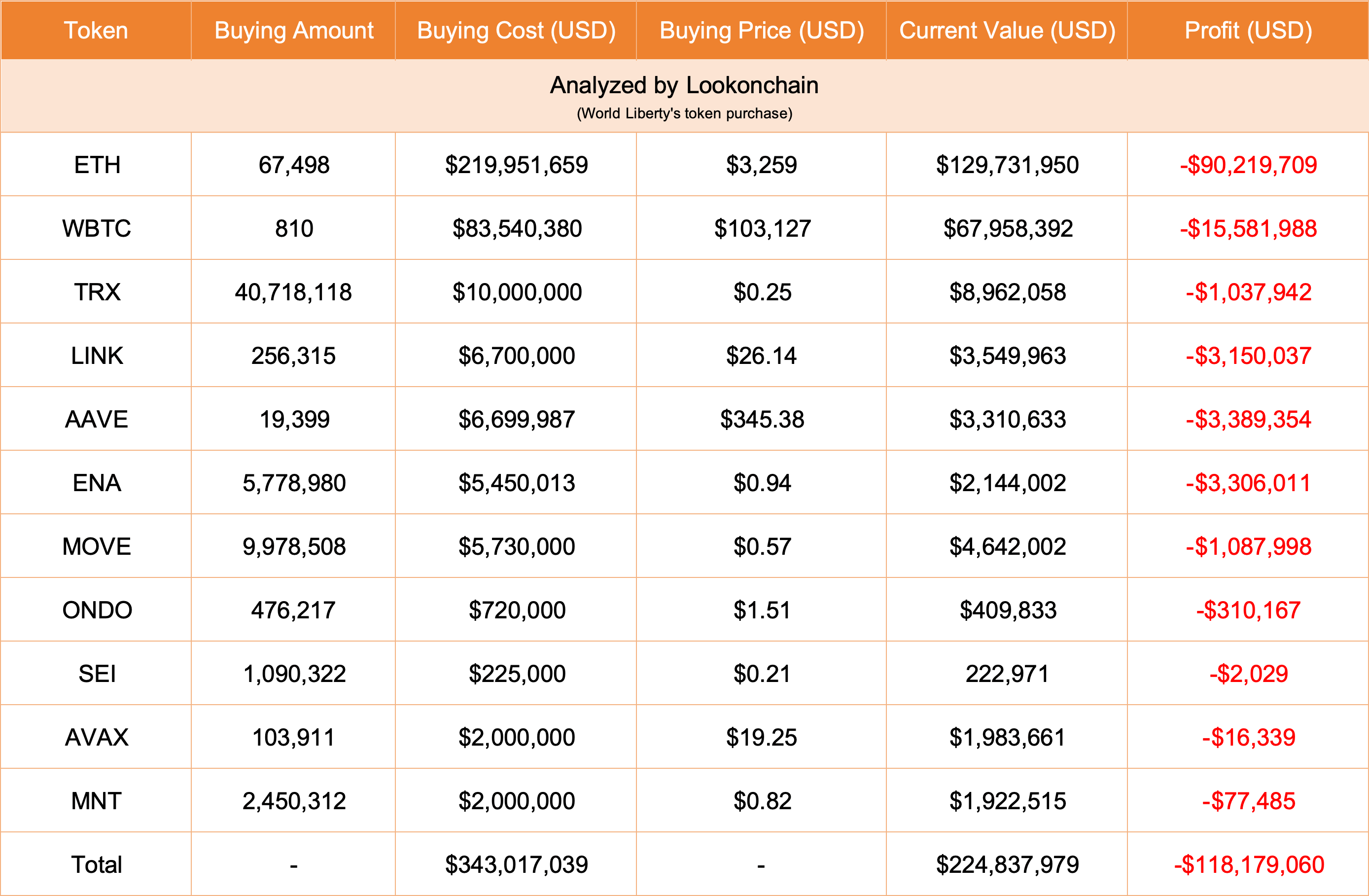 Mặc dù mở rộng mạnh mẽ, danh mục đầu tư của WLFI vẫn đang lỗ. Dữ liệu từ Lookonchain ước tính khoản lỗ chưa thực hiện khoảng 118 triệu USD, riêng Ethereum đã chiếm 88 triệu USD trong số đó.