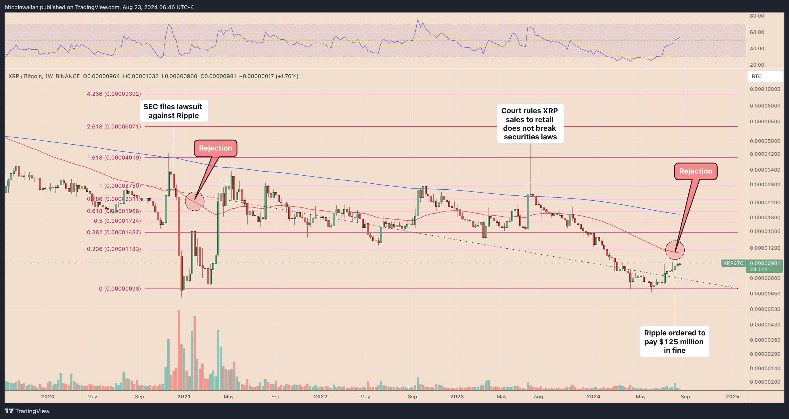 Tính đến tháng 8 năm 2024, vụ kiện đã được giải quyết, với lệnh Ripple phải trả khoản tiền phạt 125 triệu USD vì bán XRP bất hợp pháp cho các nhà đầu tư tổ chức. Kể từ phán quyết, XRP/BTC đã tăng khoảng 15%, cho thấy tiềm năng tăng thêm, đặc biệt nếu sự thống trị của Bitcoin giảm.