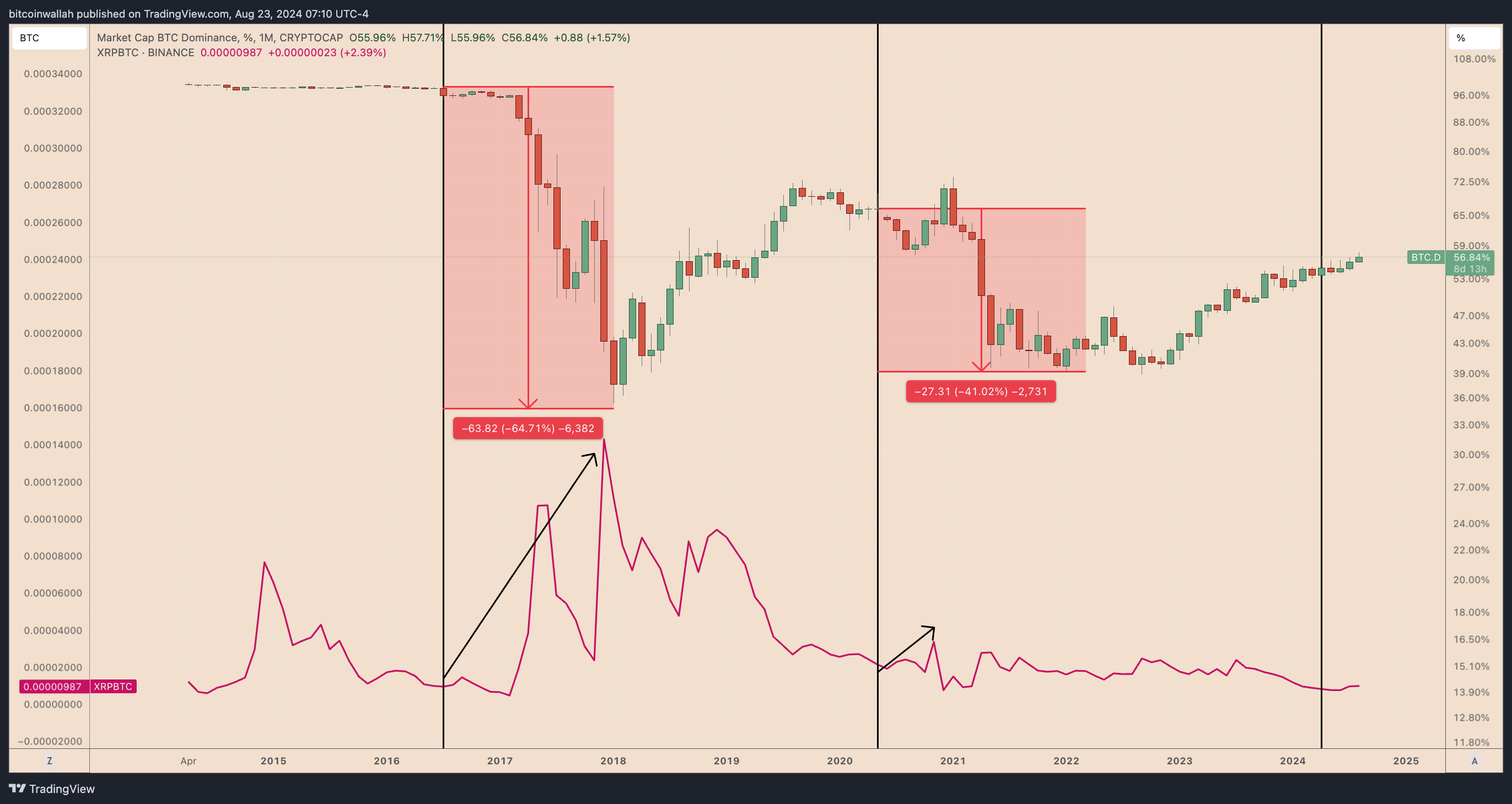 Ví dụ, Chỉ số thống trị Bitcoin (BTC.D) đã giảm hơn 70% sau lần halving thứ hai vào tháng 7 năm 2016, cho thấy các nhà giao dịch đã chuyển vốn của họ khỏi thị trường BTC để tìm kiếm sự đầu tư vào các altcoin như XRP.
